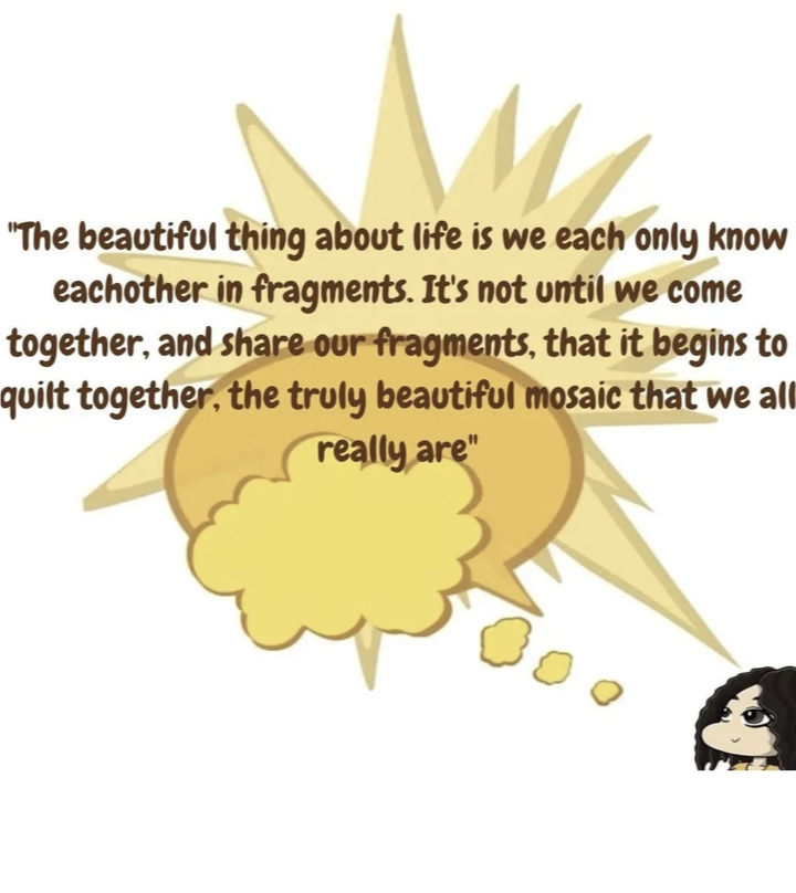 It’s often not until a ‘gathering/event’ happens in someone’s life, where a meeting of people (friends family, work colleagues etc) are able to come together and share their fragments & you see this whole brand new picture of person you would of put money on, was only “this way” cos you knew them in “this light/darkness” …